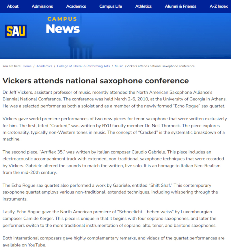 Dr. Jeff Vickers, assistant professor of music, recently attended the North American Saxophone Alliance's Biennial National Conference. The conference was held March 2-6, 2010, at the University of Georgia in Athens. He was a selected performer as both a soloist and as a member of the newly formed "Echo Rogue" sax quartet.